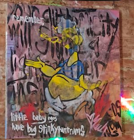 Ordering a Citywide at the El Bar and confronted with a painting of a baby duck in a diaper. The caption reads, “Remember, little baby egos have big stinky tantrums.” I guess small hands equal small dicks equals out of proportion egotism. I’m sure I don’t need to know the name of the whiskey I’m drinking anymore than I need to ponder the inadequacies of these fragile egos. But the world is falling apart and my indulgence gives me slight repose. We won’t even ruminate on the painting having deeper political meaning.